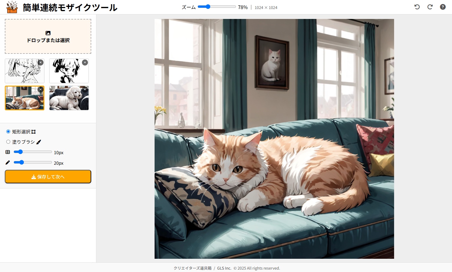 - 簡単連続モザイクツール:範囲選択やブラシ操作による直感的なモザイク処理が可能